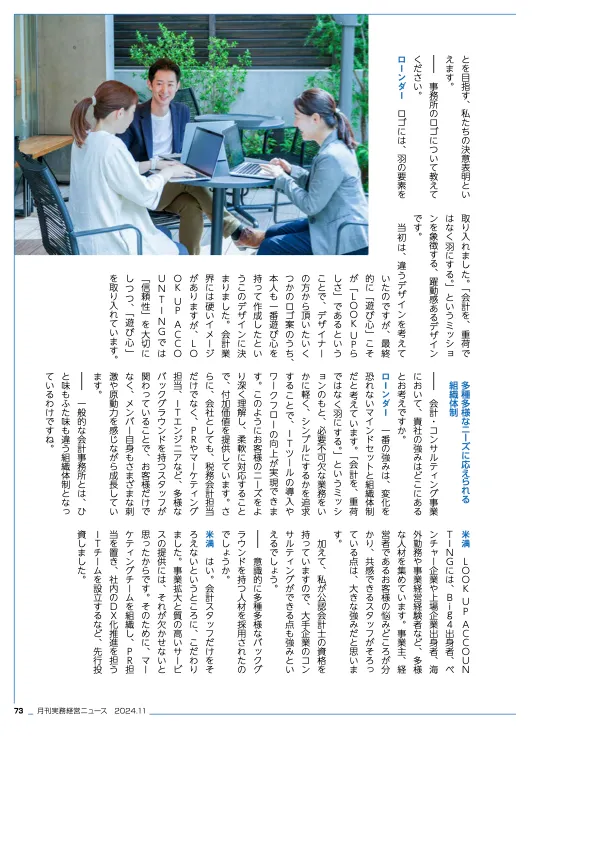 LOOK UP Co., Ltd. and LOOK UP ACCOUNTING have been featured in the November issue of BMS, a magazine on practical business management, in an article titled "LOOK UP Co., Ltd.: Unconventional Ideas and Organizational Development."