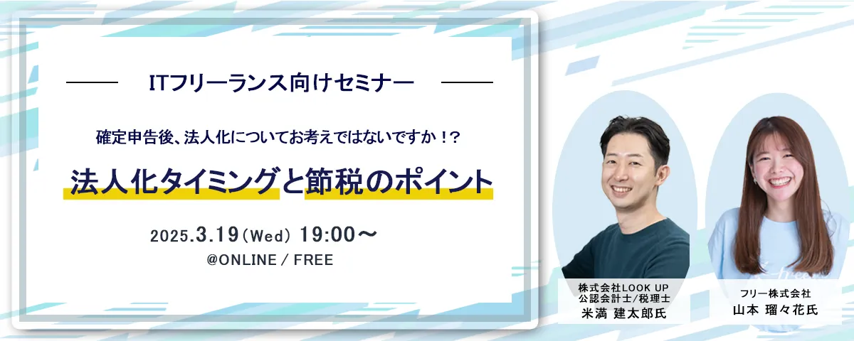 2025年3月19日(水)、ITフリーランス向け福利厚生サービス「サポートプラス」が主催するオンラインセミナー『法人化タイミングと節税のポイント』にて、LOOK UP ACCOUNTING代表・公認会計士/税理士の米満建太郎が登壇いたしました。